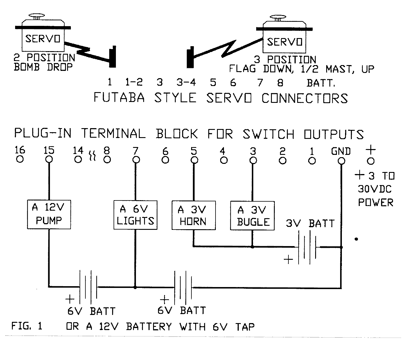 Servo Command Pulse outputs "1-2" and "3-4" are the three position servo outputs. Logically 2 switches on the KeyPad are required to define 3 positions (4th possibility not used). Further, the two and three positions are designed so that a three position servo output shares a transmitter KeyPad switch with a two position servo output. For example: KSw1 controls servo SCP1 which operates as two position actuator. But KSw1 also commands the second SCP2 servo, along with KSw2, for one of three positions. In practical situations either 2 two-position servos OR 1 three position servo would be deployed. The actual servo positions are assigned in groups to provide a variety of combinations as delineated in Fig 5. The three positions are adjustable by three factory set and secured trimming potentiometers. Receptor ON-OFF Switch outputs are each capable of current sinking to ground 0-30 VDC@ 5 amps. This means they switch to ground to complete the circuit to operate your device. Because they switch to ground they easily accomodate a variety of lights, horns, motors and other loads operating on a variety of voltages up to 30VDC by simply using different batteries or taps on a series connected set of batteries. See Figure 1 above for examples. Total continuous "box"