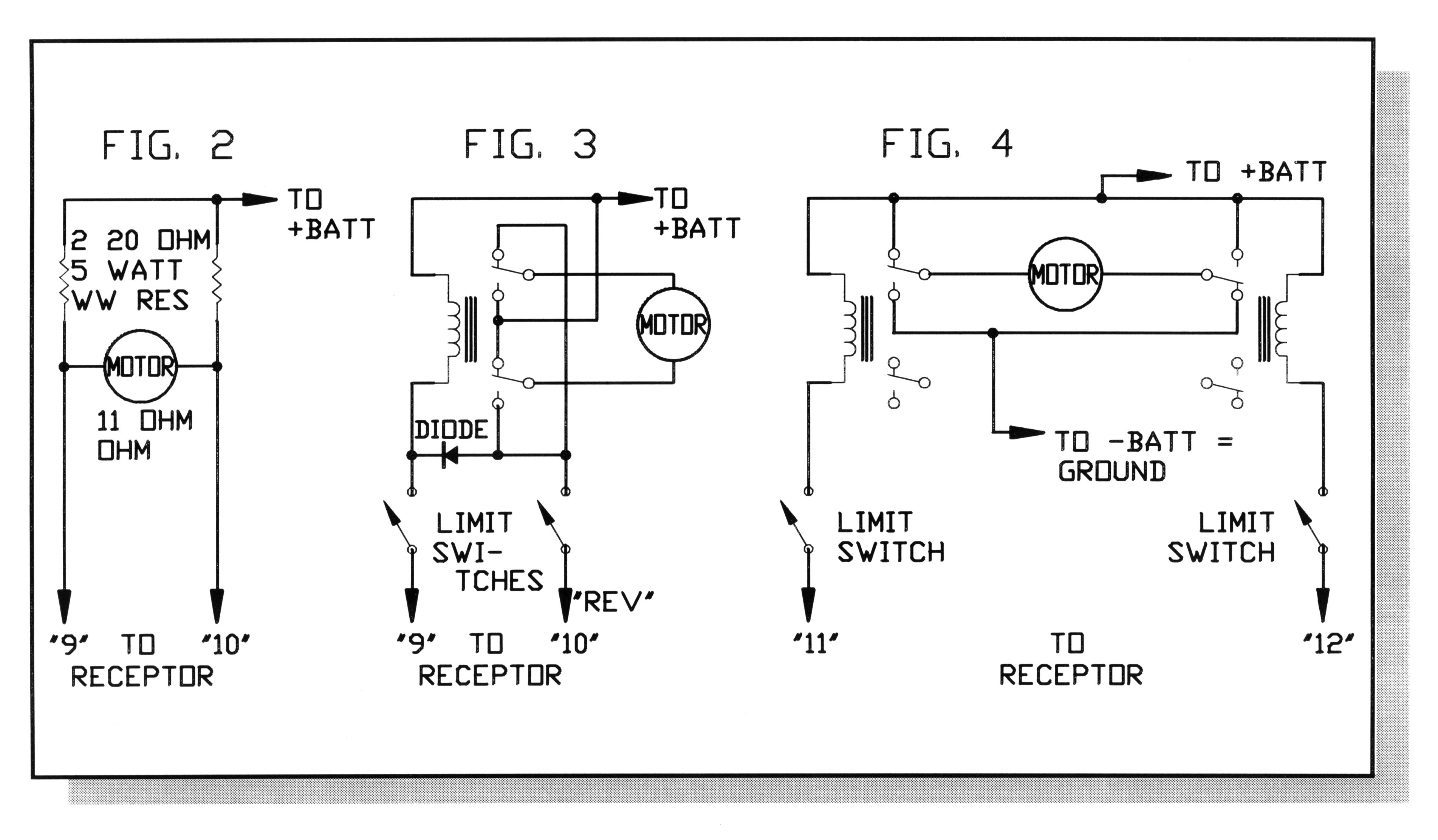 resistor values can be used for different forward and reverse speeds. Experimentation is required, but for a 12V battery bridge resistors should be greater than 15 ohms; 24V battery - 30 ohms. Put a MOV across the motor brushes. To maintain satisfactory R/C operation select quality motors whose RFI qualities are known from past R/C applications. Some situations may require RF chokes in series. Don't use toy motors with metal brushes or automobile-type horns because these devices generate horrific RF Interference. Relays may be used to amplify the current capacity or provide handy operating logic such as reversing high current motors. Use MOVs across their contacts to minimize RFI as well as in parallel across the coil for spike suppression. Additional MOVs are available from VANTEC or Radio Shack. Use AC types rated for 30-50 volts such as Panasonic ERZ-V05D390. Figure 3 shows efficient operation of reversing motors up to 5 amps using a single 5 amp relay and 5 amp diode from Radio Shack. If your application runs into a physical stop use the limit switches shown to prevent dangerous stalled motor operation. For limit switch installations you can have automatic reverse/return by connecting wire "REV" to ground instead of a Receptor output, omit diode, (saves a KeyKoder channel too). Don't forget the MOVs. Figure 4 shows the use of relays to operate much larger motors, over 4 amps. In this circuit the limit switches need only be capable of handling the relay coil current. Use MOVs. If the Receptor fails to receive KeyPad signals it uses the old information for a brief time and then enters a fail safe mode. In the fail safe mode all electronic switches are turned off except KCh14 & 15 which maintain their last state. You could use KCh14 to command lighting since your vehicle could be at rest but illuminated with the transmitter turned off; great for preventing runway collisions at night or dinner flotillas. KH16R and KH32R Receptor power wiring is through the 18 station plug-in terminal block. The ground circuit which supports these electronic switches-to-ground must be substantial since all the current