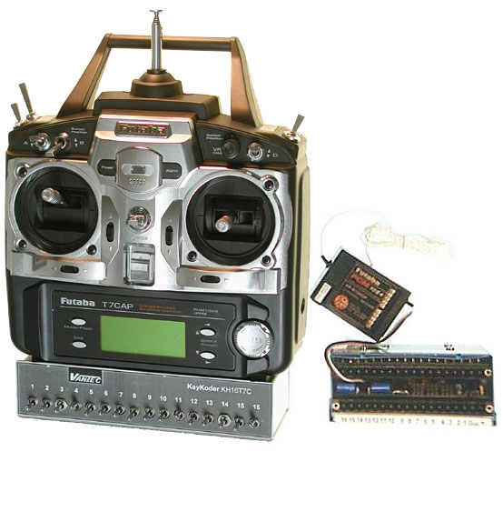 To make a complete Hitchiker system VANTEC adds two devices to the Futaba set. The first is the transmitter mounted KeyPad with 16 special toggle switches that provide momentary operation like a push button by pressing down; they automatically spring back to center off; or switch them "On" continuously like a normal toggle switch by flipping them up.