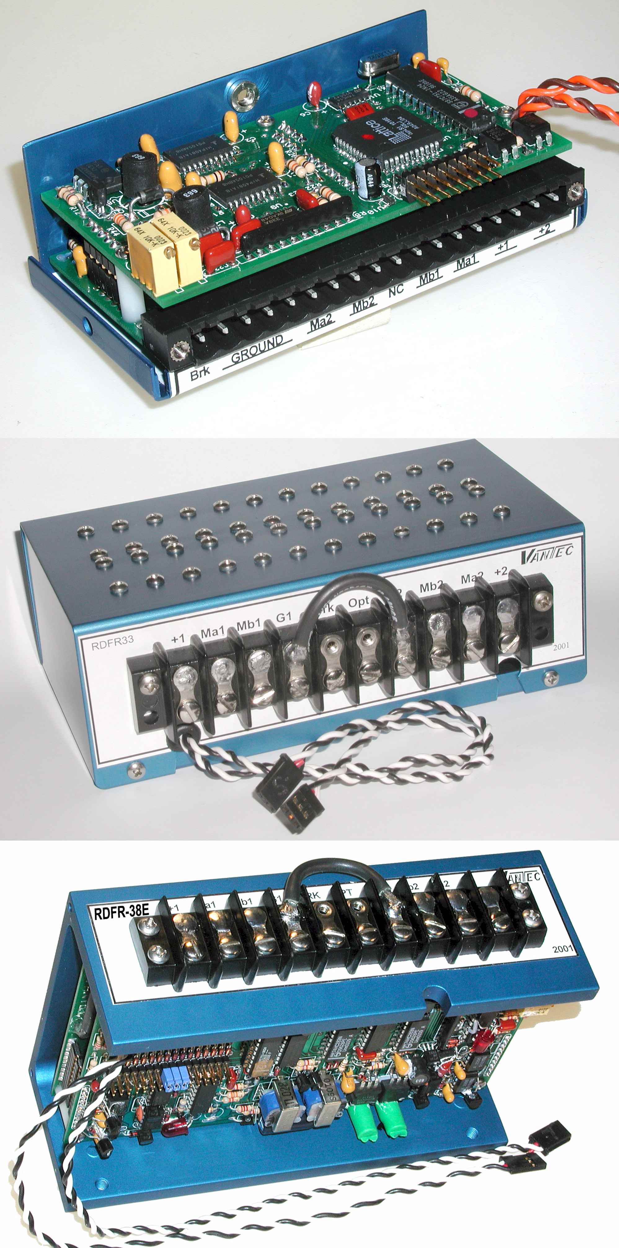 The optically isolated outputs are Pulse Width Modulated full H-bridge circuits originally designed for Permanent Magnet DC wheel chair motors. N-channel power MOSFETs are paralleled in each H-bridge leg to achieve the specified amperage. For example: the RDFR38 contains 48 70 Amp MOSFETs. In contrast to hobby controllers VANTEC's MOSFETs are all properly thermally mounted flat to the metal heat dissapating case with special insulating washers.